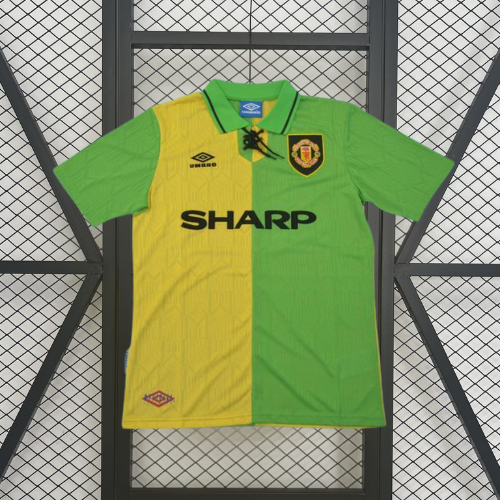 Luce con orgullo los colores del Manchester United con la Colección Retro 92/94, una de las camisetas más icónicas del club, con el llamativo diseño mitad verde y mitad amarillo que marcó una época inolvidable en los años 90.